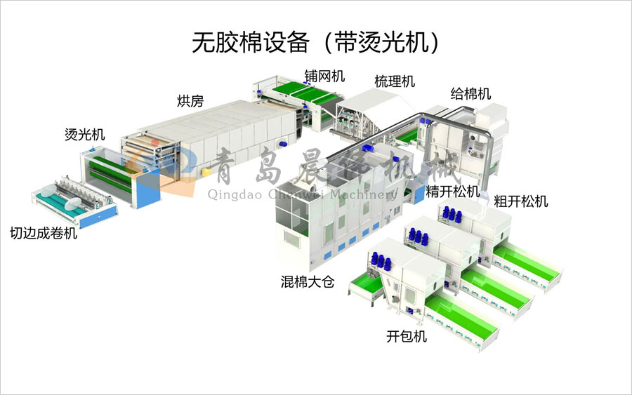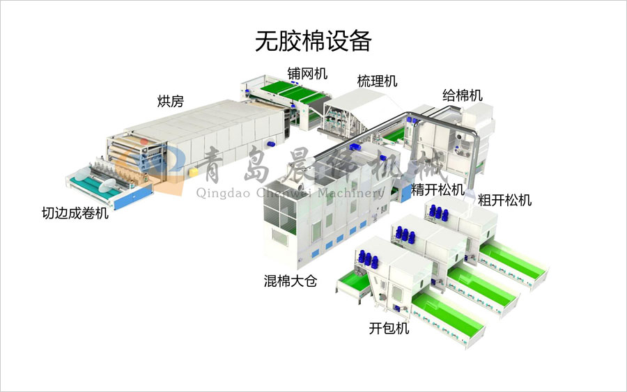 一、無(wú)膠棉設(shè)備工藝流程: