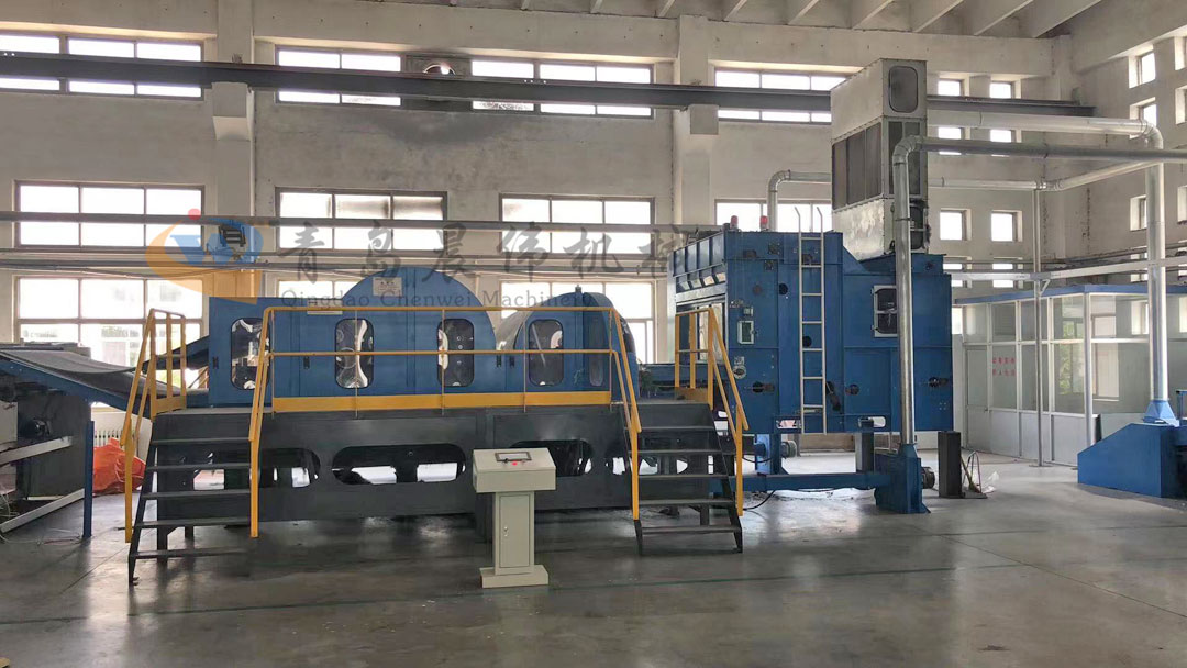 開(kāi)包機(jī)-開(kāi)松機(jī)-振動(dòng)給棉機(jī)-梳理機(jī)-鋪網(wǎng)機(jī)-烘房-切邊成卷機(jī)