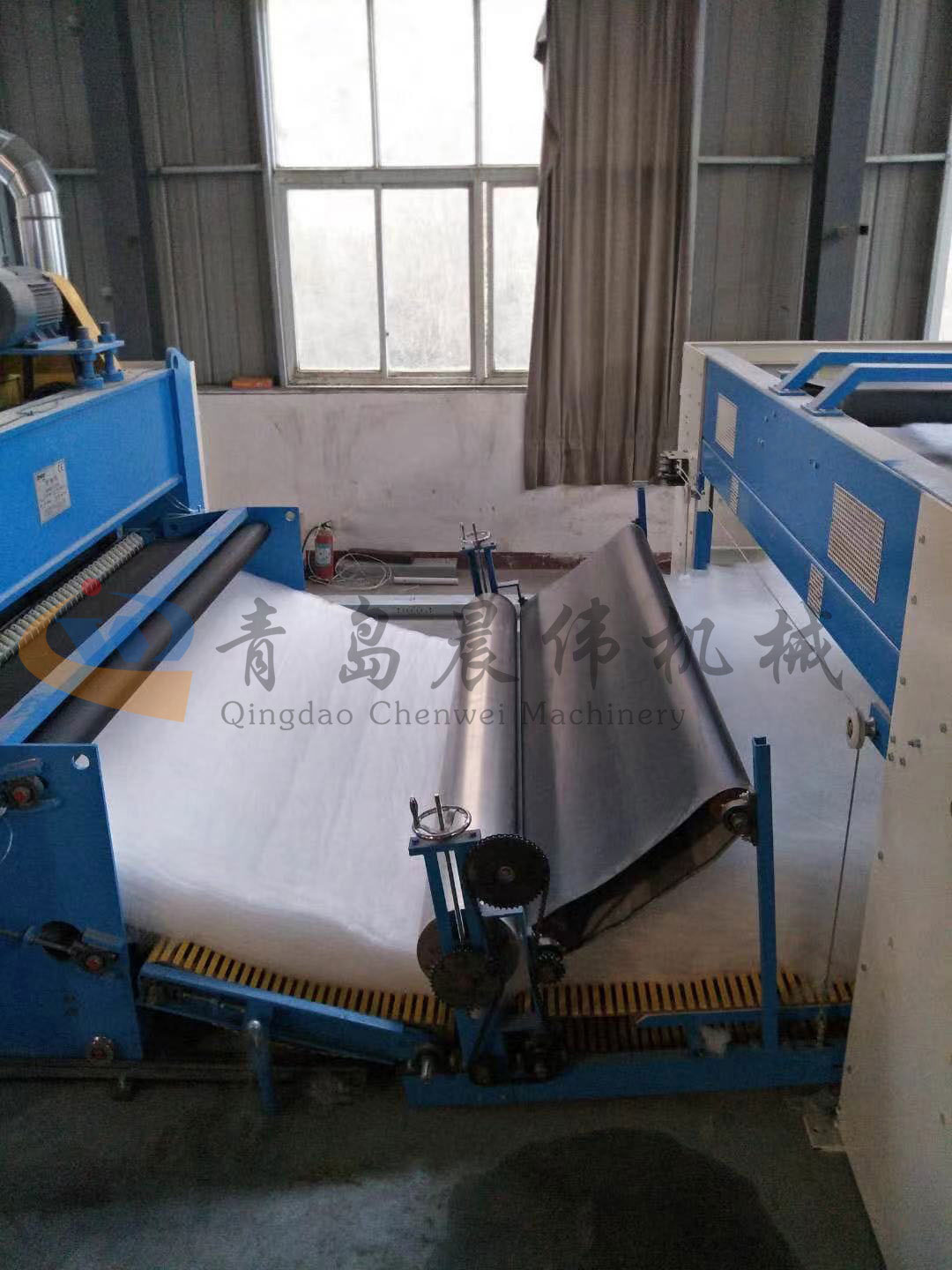 5. CWPW-鋪網(wǎng)機(jī):用于將梳理纖網(wǎng)通過移動小車交叉折疊為所需幅寬和定量的多層纖網(wǎng),以供后道工序使用。鋪網(wǎng)輥采用特殊結(jié)構(gòu),加裝壓網(wǎng)輥和導(dǎo)流板,不飄網(wǎng)不起皺,五只大功率電機(jī)精確控制各部件的運(yùn)動,電動輸出簾高度調(diào)節(jié)裝置